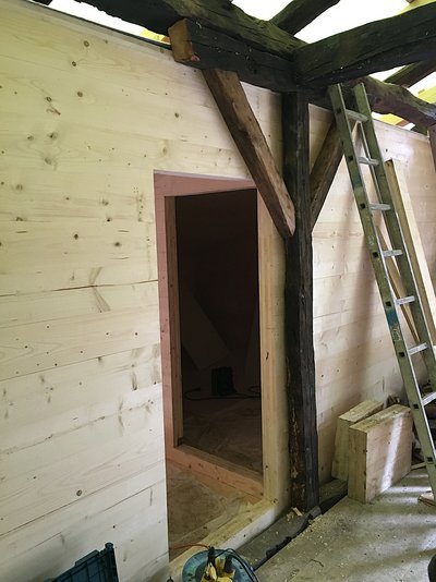 Sanierungsarbeiten beim Bestand, Ergänzung in Holzbauweise und Dacheindeckung mit Holzschindeln